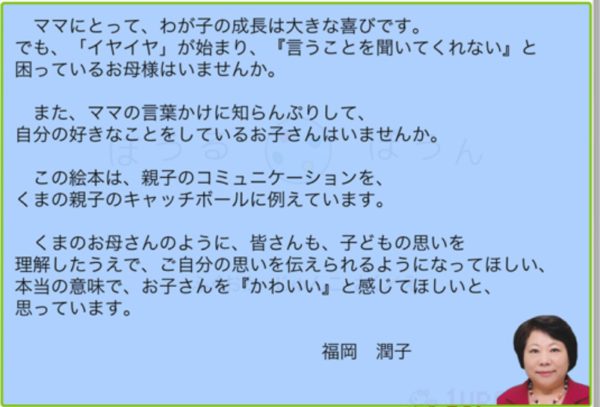 この絵本は、人気幼児教室主宰ほか、様々な幼児教育分野で活躍する福岡潤子先生の作・絵によるものです。「親子のコミュニケーション」が、くまの親子のキャッチボールにたとえられ、各ページ毎に福岡先生の解説を読むことができます。お子さんにはかわいい絵と電子書籍ならではのサウンドで楽しく、保護者の皆さんにはわかりやすく学べる教本として、親子で楽しみながら自然に学ぶことができる画期的な絵本です。