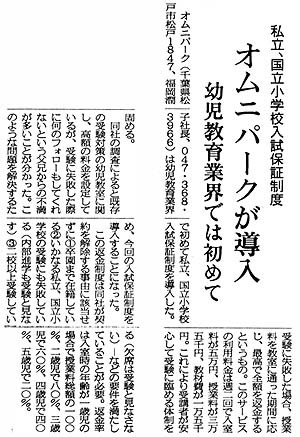 流通サービス新聞(日刊工業新聞刊)13面にオムニパークの私立・国立小学校合格保証制度付き受験コースを紹介する記事が掲載されました。流通系の新聞において私立小学校受験をテーマにした記事は極めて珍しい事だそうです。